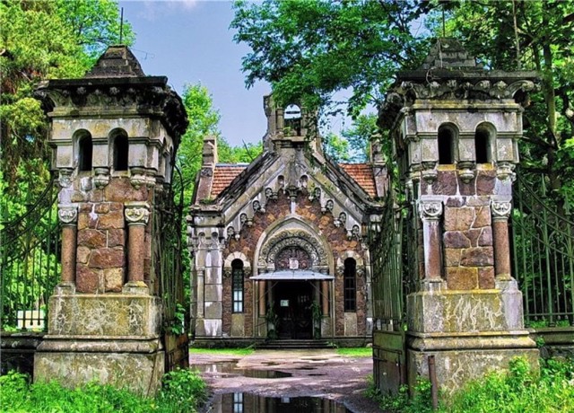 On the reverse side of the park is a chapel-mausoleum, built in the neo-Romanesque style according to the project of the architect Vladyslav Horodetskyi in 1904 by order of Kostyantyn and Yanyna Potocki. In Soviet times, it was used as a cinema. Today it is the church of Saint Andriy.