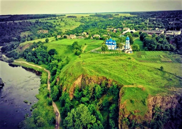 From the plateau in front of the church, a breathtaking panorama of the Pivdenny Buh valley with a cascade of rapids opens.