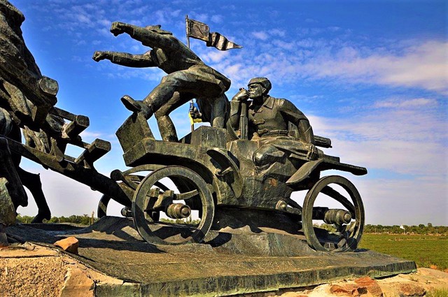 The "Legendary Tachanka" monument in Kakhovka is a grandiose sculptural composition in honor of the mobile firing point, which was widely used during the Soviet-Ukrainian war.