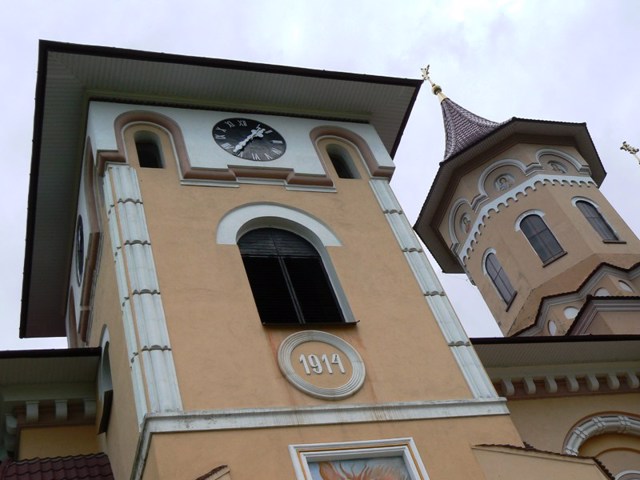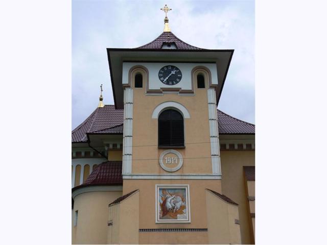 It was built in 1914 under the direction of German and Czech architects in traditional Romanian architectural forms. A clock is installed on one of the towers.