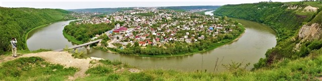 Звідси добре проглядається автомобільний міст над Дністром та куполи Хрещатицького монастиря.