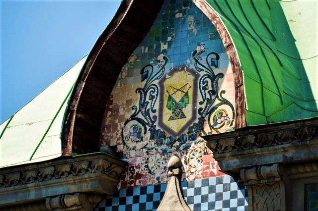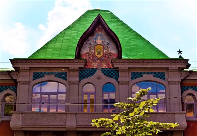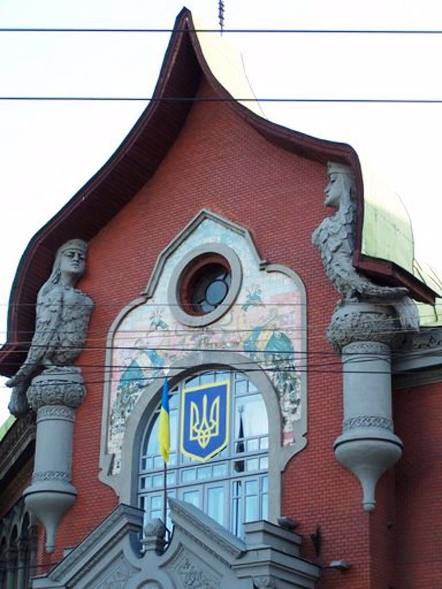 Architect Oleksandr Kobelev designed the building, which is now considered one of the best examples of Ukrainian modernism. And the decorations are widely used details of Rus architecture. Multicolored mosaics give a special picturesqueness. The central entrance at the truncated corner of the building is decorated with a decorative mosaic panel with firebirds and siren sculptures.