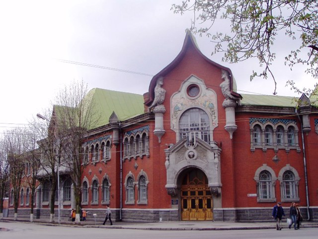Архітектор Олександр Кобелєв розробив проєкт будівлі, яка тепер вважається одним із найкращих зразків українського модерну. І оздобленні широко використані деталі руської архітектури. Особливу мальовничість надають багатобарвні мозаїки. Центральний вхід на зрізаному куті будівлі прикрашений декоративним мозаїчним панно з жар-птахами та скульптурами сирен.