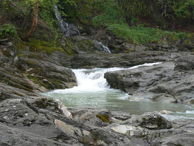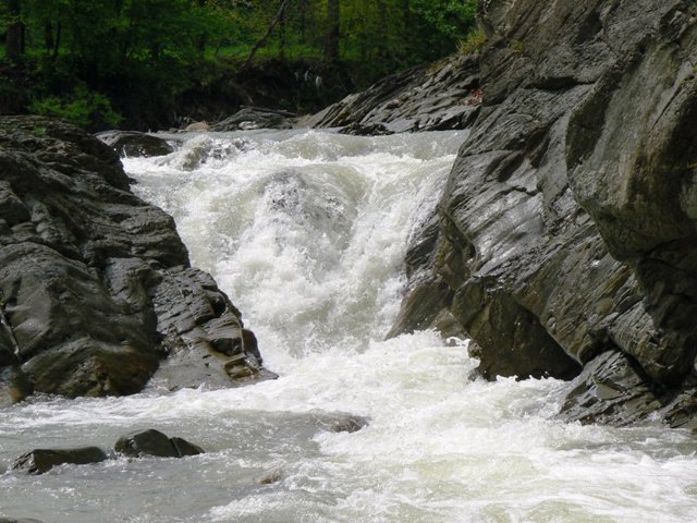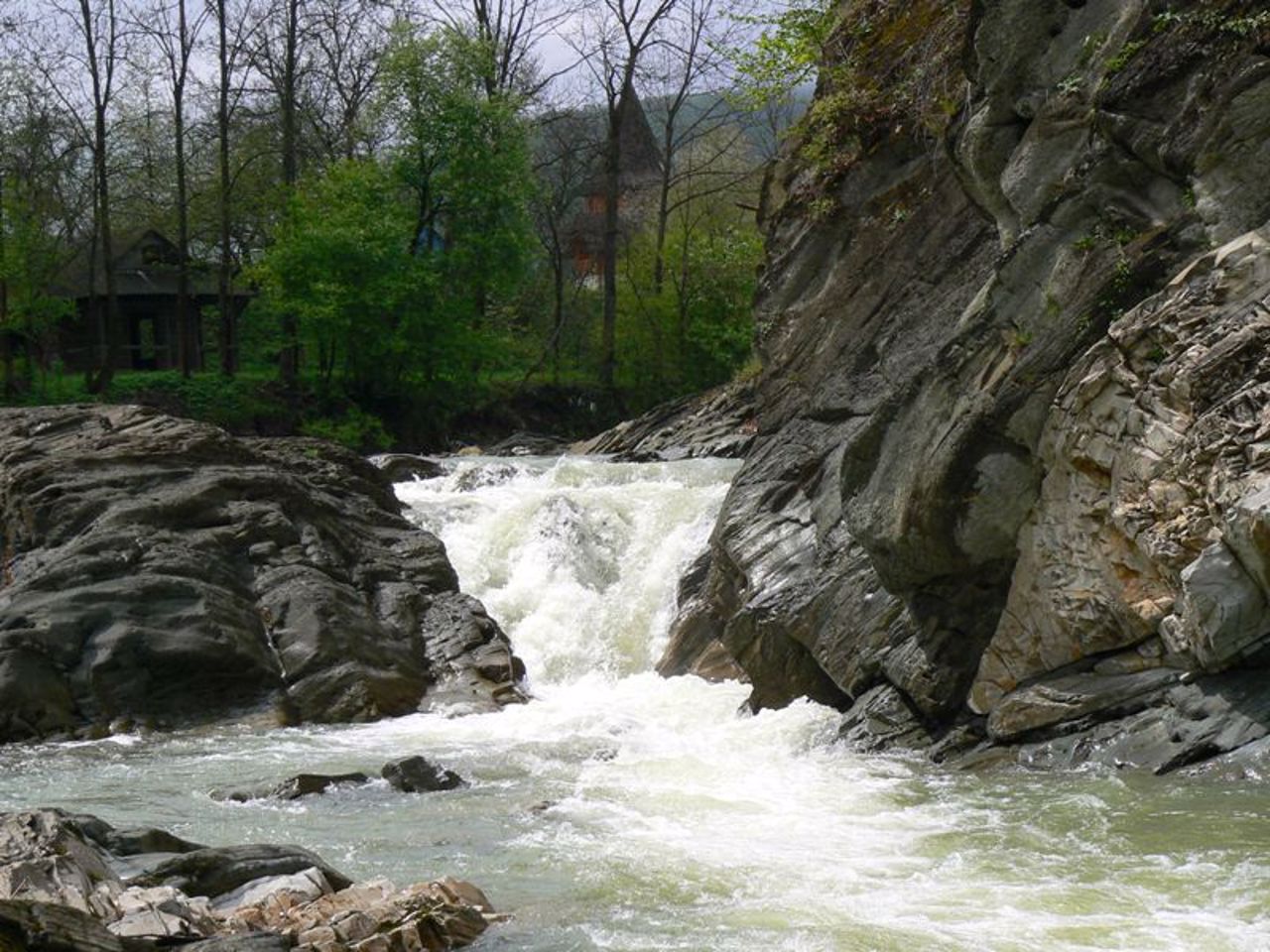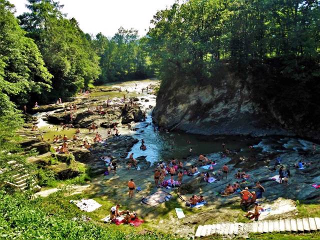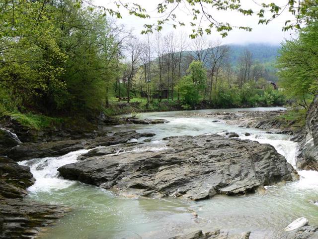 The waters of the small Pistynka River (a right tributary of the Prut) overcome massive sandstone boulders here for several hundred meters, creating two parallel waterfalls 5 and 3 meters high (Velikyi and Malyi Huk). They got their name due to their powerful voice and the fact that the sprays sparkle very brightly in the sun.