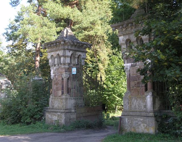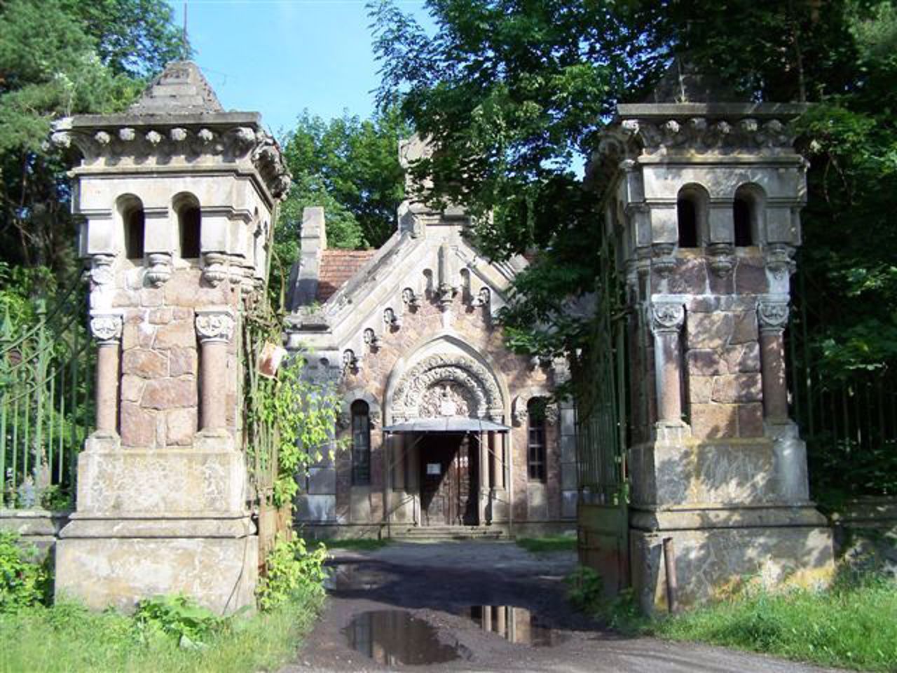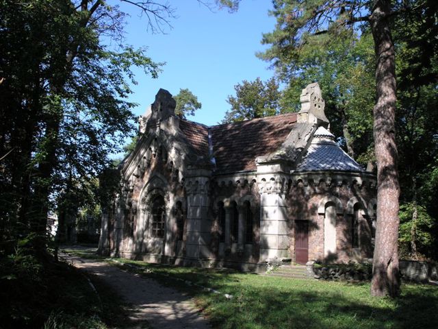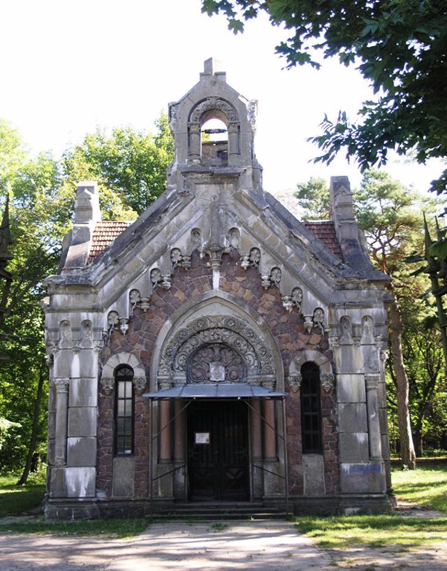 On the reverse side of the park is a chapel-mausoleum, built in the neo-Romanesque style according to the project of the architect Vladyslav Horodetskyi in 1904 by order of Kostyantyn and Yanyna Potocki. In Soviet times, it was used as a cinema. Today it is the church of Saint Andriy.