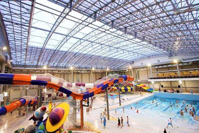 There are 5 swimming pools, a jacuzzi, a SPA area, saunas, 9 slides, a large children's area, bars and restaurants, recreation areas on 4 floors. Equipment from the Canadian manufacturer Whitewaters is used. The longest and fastest slide "Master Blaster" is 200 meters long. Other slides: "Virage", "Tsunami", "Snake", "Cosmic Vortex" and "Multislide" (total length 1 kilometer). Wave pool with an area of 550 square meters.