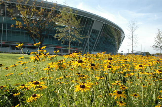 A park with fountains, man-made ponds and a 2.5-hectare rock garden was built next to the stadium.