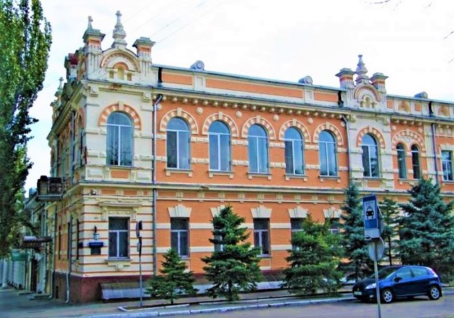 Eclectic building, faced with brick, richly decorated in Romanesque and Moorish style. Since 1911, the Kherson branch of the St. Petersburg International Commercial Bank was located here.
