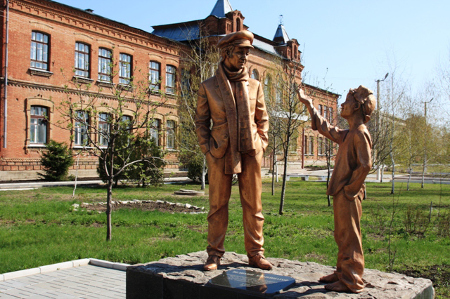 A monument to Ostap Bender, the hero of the satirical work "12 Chairs" by Ilya Ilf and Yevhen Petrov, is erected in front of the old building of the former female gymnasium in Starobilsk, where the faculty of Luhansk National University named after Taras Shevchenko is now located.