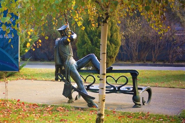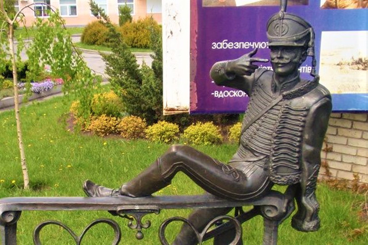 The Belarusian sculptor Volodymyr Zhbanov depicted lieutenant Rzhevsky, who carelessly sits on the back of a bench and carelessly twists his mustache.