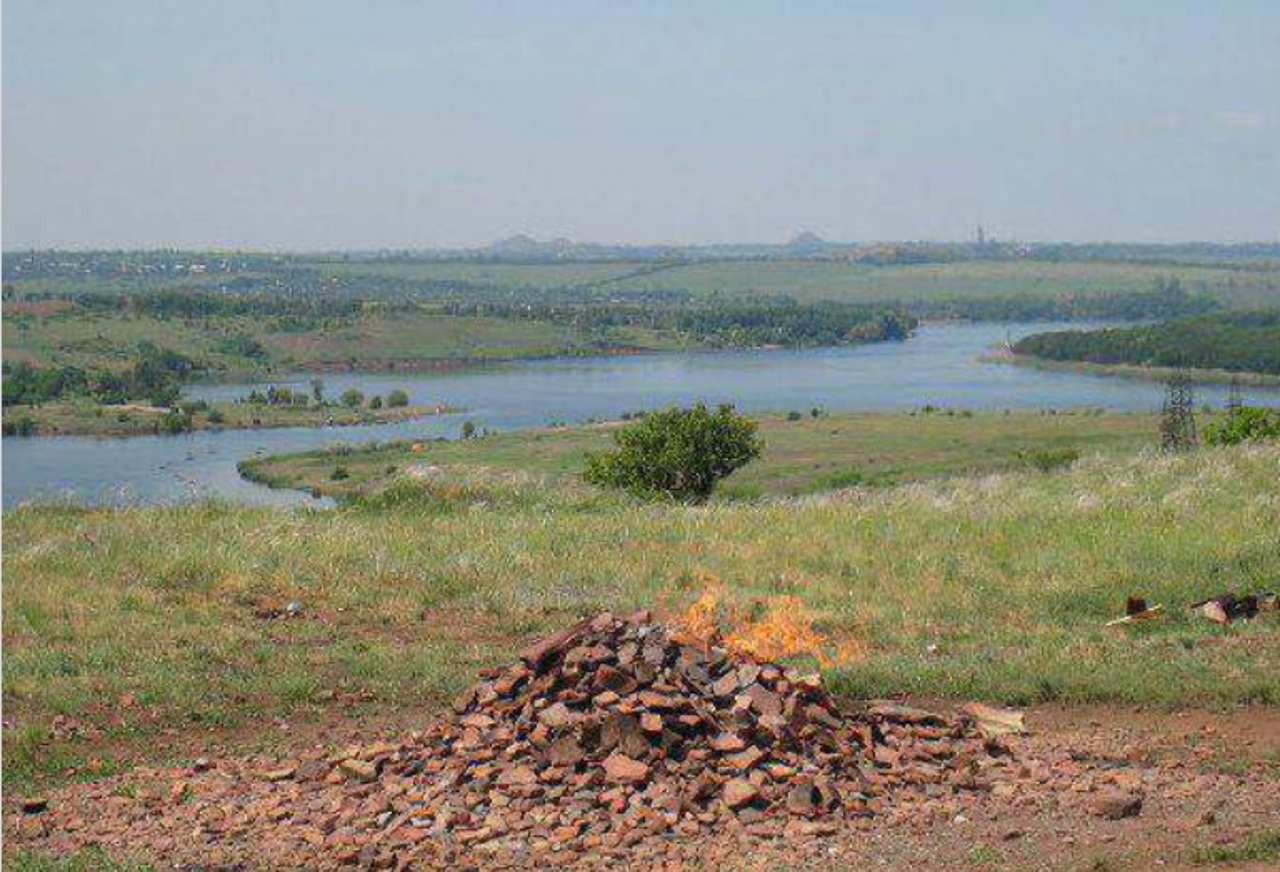 Палаюче каміння - місце виходу палаючого метану на поверхню в районі річки Нижня Кринка. Природна дегазація надр. Світиться сланцевий або вугільний газ.