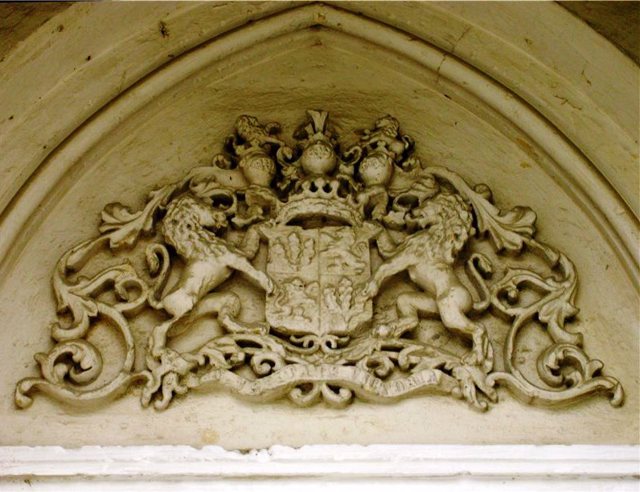 On the pediment of the chapel, a family coat of arms with two lions holding a crown is inlaid.