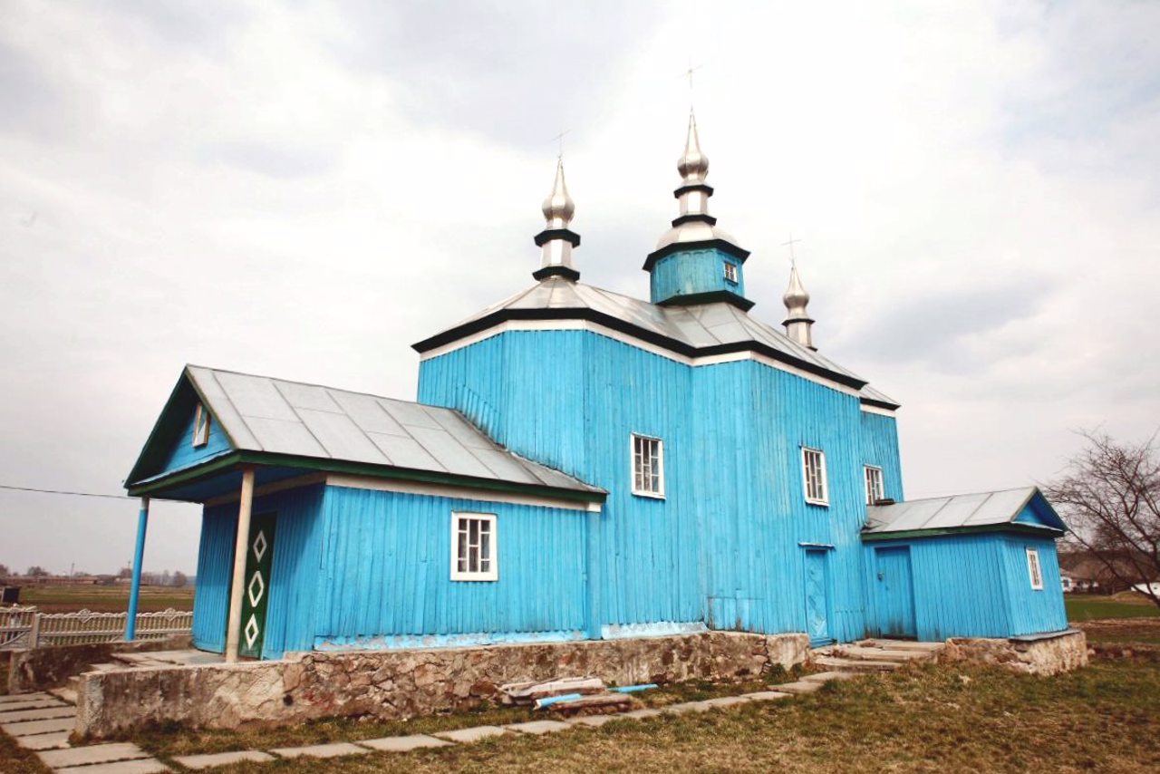 With its simple architectural forms, this small three-headed church resembles early examples of Ukrainian wooden architecture.
