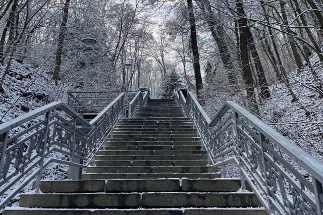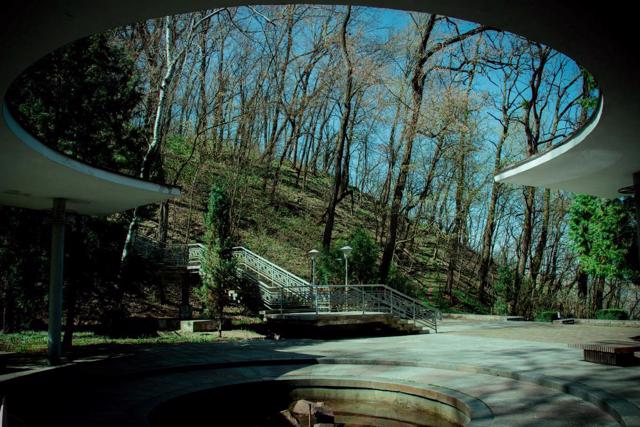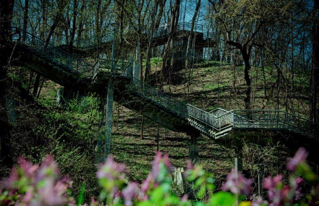 From the pier and parking lot at the foot of the mountain, a granite staircase with 392 steps leads to its top, with recreation areas and the "Lilium" fountain (1977, architect Anatoly Moshenskyi).
