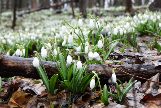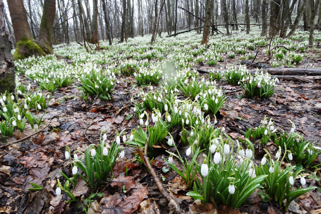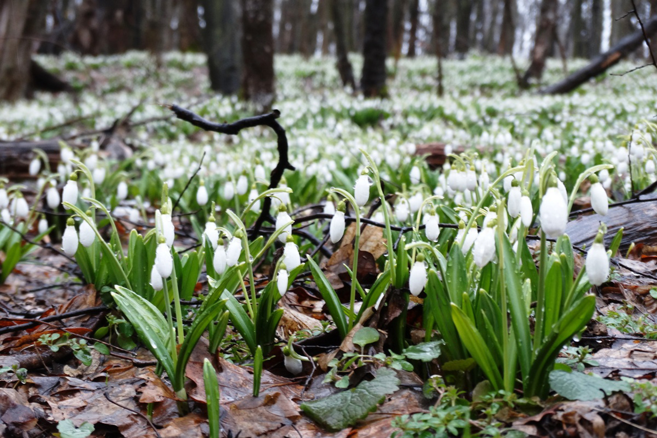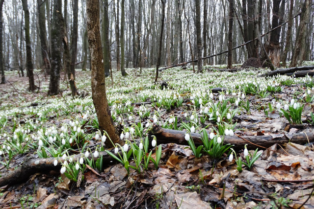 The largest massif of snowdrops in Kholodny Yar grows on the territory of the "Belosnizhnyi" botanical reserve 1.5 kilometers northeast of the Motronynsky Monastery. This snowdrop glade is especially popular among tourists during the flowering of primroses during March and early April.