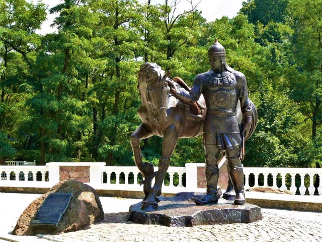 On the opposite bank, there is a monument to Dobrynya Mykytovych, who is considered a native of Korosten, as well as a monument to Princess Malusha of Drevlyany and her son, the future Prince Volodymyr the Great. In 2015, opposite the central entrance to the park, a monument to Prince Volodymyr was erected (sculptors Vitaly Rozhik and Vasyl Feshchenko).