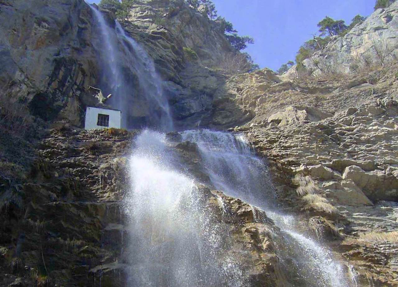 Знаходиться в горах за 10 кілометрів від Ялти. Назва перекладається з татарської як "літаюча вода".