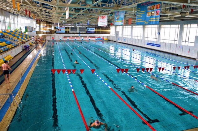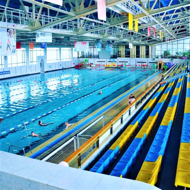 В залі з трибунами є спортивна ванна розміром 50 на 21 метр, призначена для проведення змагань з плавання на восьми доріжках. Стрибкова ванна розміром глибиною 5,5 метрів обладнана трамплінами і вежами висотою до 10 метрів. У ванні атракціонів розміром 16,5 на 8,5 метрів є швидкісна гірка завдовжки 26 метрів, фонтани, водний потік, водоспади, гідромасаж. Для наймолодших відвідувачів призначена дитяча ванна з фонтанами та водяною парасолькою (температура води +32°С).