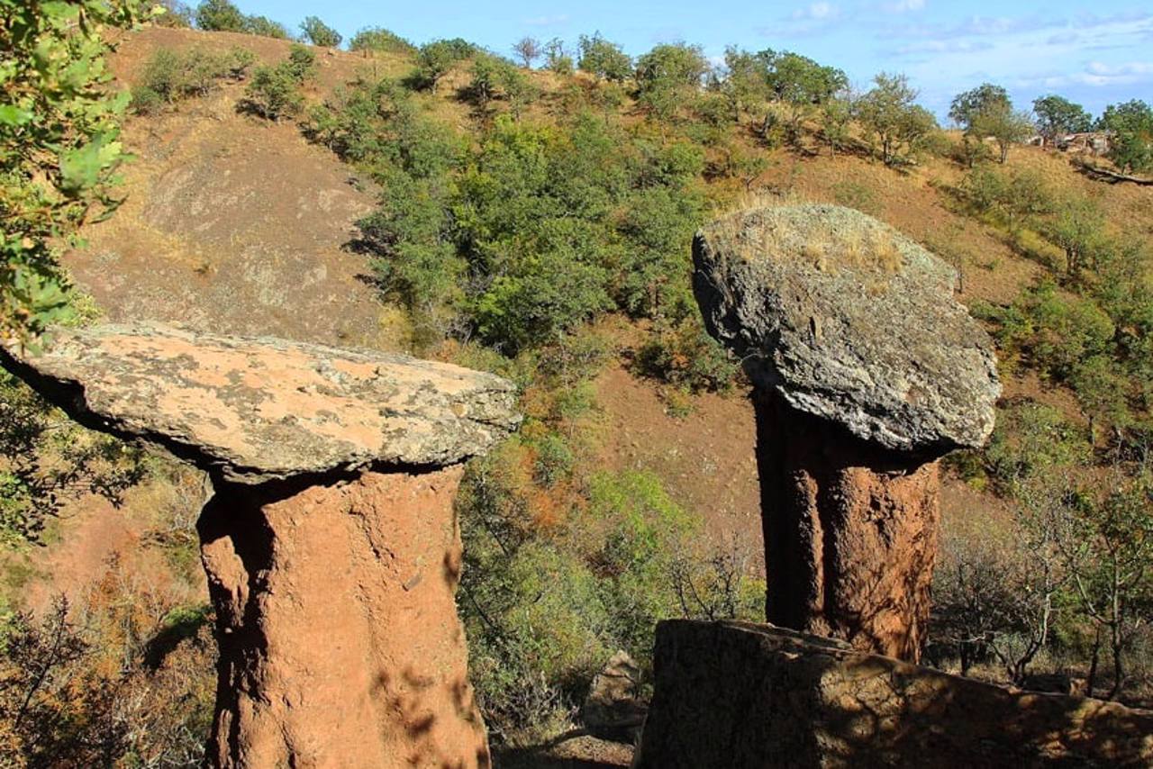 Здесь в процессе выветривания и водной эрозии образовались удивительные каменные грибы высотой до 7 метров. Шляпки "грибов" образованы плотными плитами конгломерата, а "ножки" - более рыхлыми отложениями, которые быстрее "шляпок" подвергались разрушению, в основном, водой, стекающей со склонов. Есть большие грибы с диаметром "шляпок" до 2 метров, и грибочки поменьше - около 1 метра высотой. Со временем грибы разрушаются под действием эрозии, но при этом появляются новые.