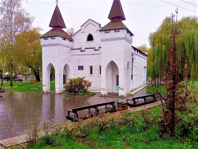 На березі ставка стоїть маленька неоготична будівля дитячої школи мистецтв з двома гостроверхими вежами.