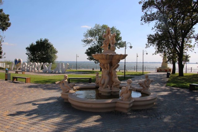 Місто Берислав розташоване на правому березі Каховського водосховища поруч з Новою Каховкою.