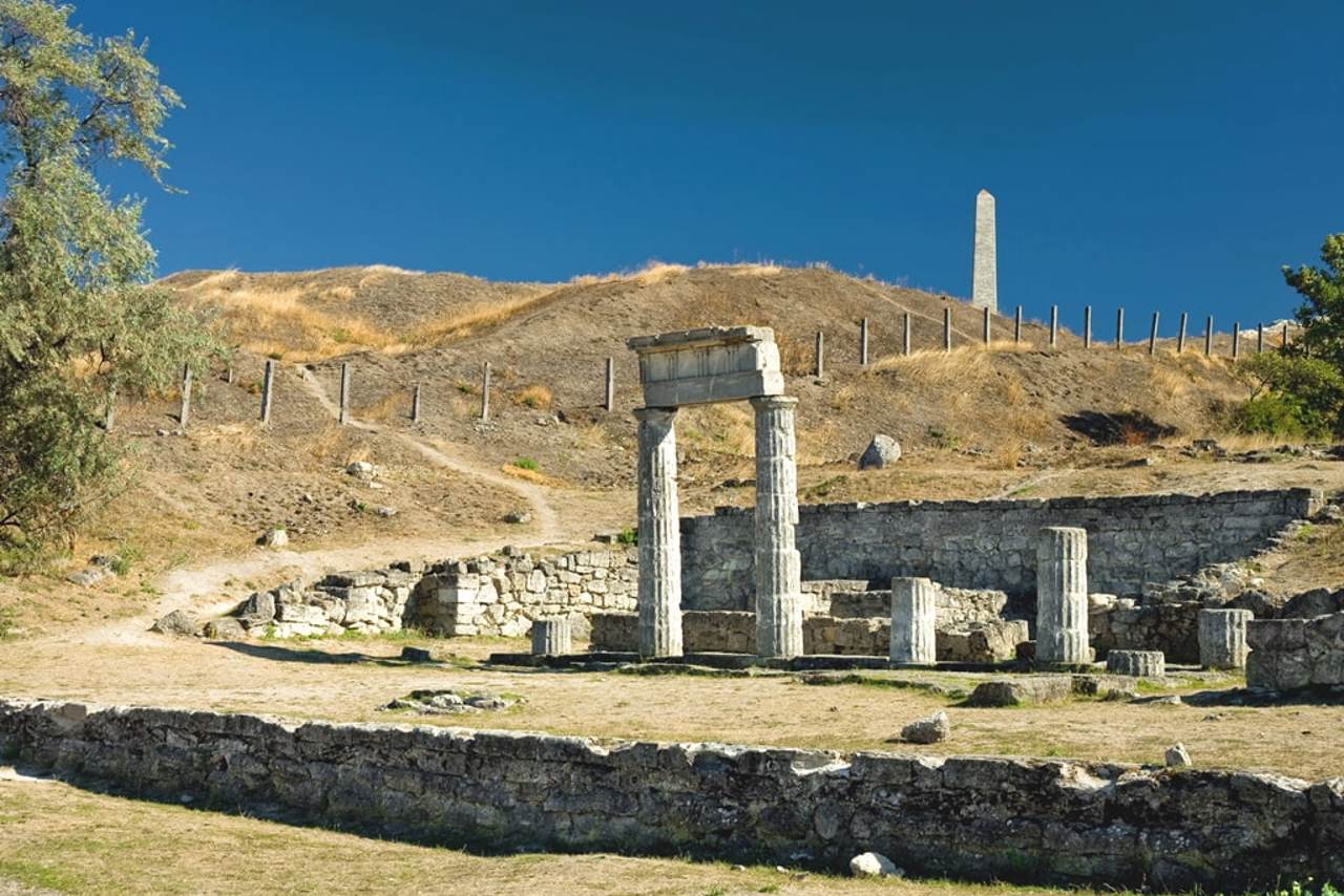 Руїни античного міста Пантікапей знаходяться на вершині та схилах гори Мітридат у центрі сучасної Керчі.